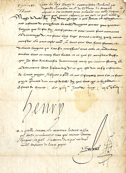 Manuscript Order Signed ‘Henry’ by the king with a clear, bold signature, instructing Monsieur de Villeroy to provide silver for the construction of ‘une table d’argent portee par quatre satyres’, with orders for the necessary payments to be made to the goldsmiths, countersigned Bocherel, later annotations in French, addressed to Villeroy on verso. Translation: ‘I have given instructions to Pol Romam and Ascaigne, my goldsmiths, to complete the silver table supported by four satyrs, which the late King, my lord and father, had begun; and for this reason I beg you to have supplied and delivered to them the silver which will be necessary to them for that, and inform me how much you have had to obtain’